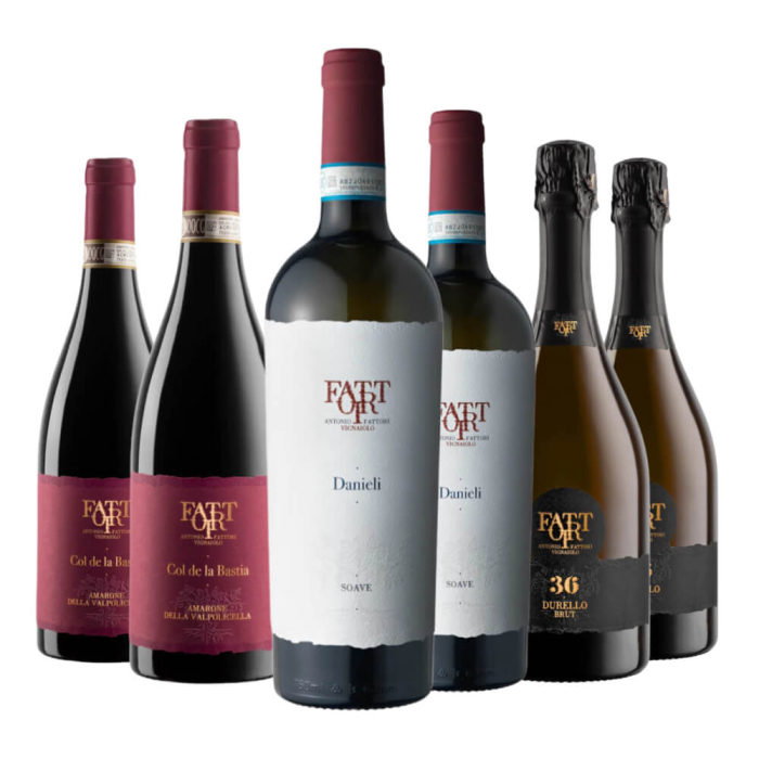 La confezione contiene: 2 bt: Valpolicella DOC Col de la Bastia 2 bt: Soave DOC Danieli 2 bt: Metodo Classico 36 mesi DOC Lessini Durello Totale 6 bottiglie