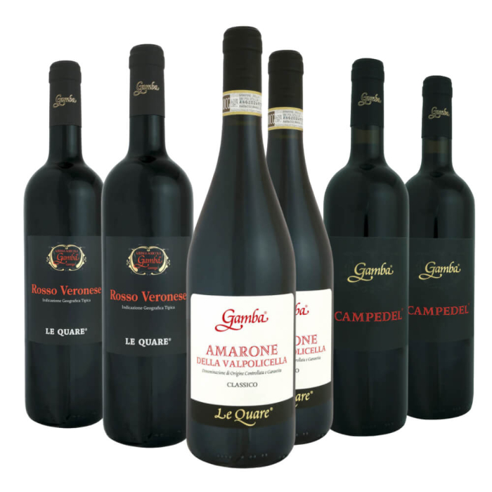 La confezione contiene: 2 bt: Rosso del Veronese IGT Le Quare 2 bt: Rosso del Veronese IGT Campedel 2 bt: Amarone della Valpolicella DOCG Classico Le Quare Totale 6 bottiglie