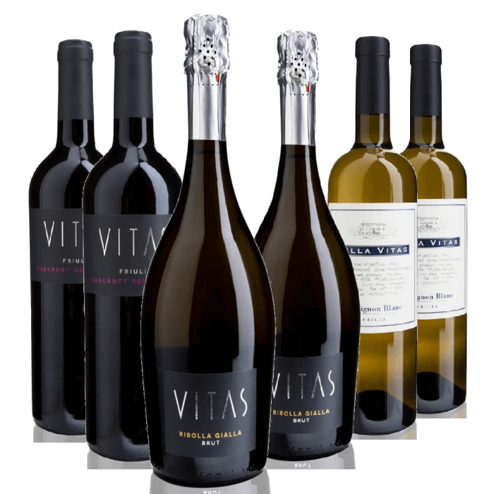 La confezione contiene: 2 bt: Sauvignon Blanc DOC Friuli 2 bt: Cabernet Sauvignon Friuli DOC Vitas 2 bt: Ribolla Gialla Spumante Brut Totale 6 bottiglie