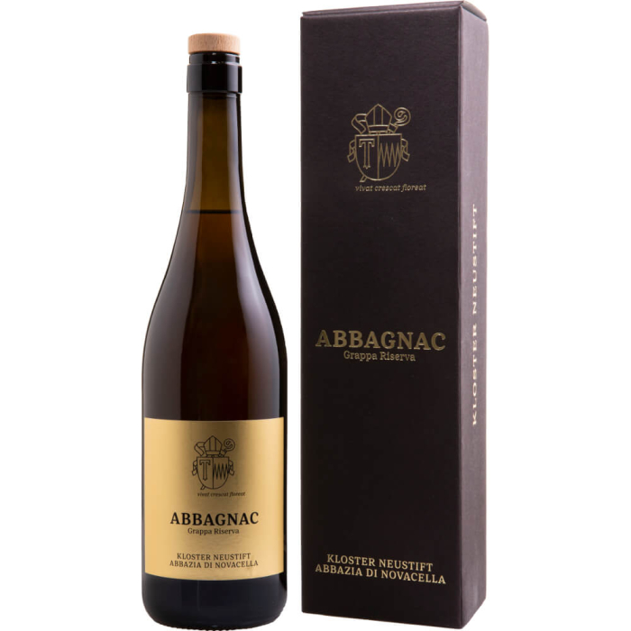 Anche nei distillati, così come nei vini, i monaci della Abbazia di Novacella mettono tutta la loro cura, passione ed esperienza, e ci propongono grappe di assoluta purezza e spiccata tipicità varietale. L’Abbagnac Riserva è ottenuta da un accurato assemblaggio di vinacce di varietà aromatiche provenienti dai vigneti di proprietà della Abbazia, ha un intenso bouquet fruttato ed un caldo colore ambrato, dovuto all’affinamento per almeno sei mesi in barriques di rovere. Da degustare come digestivo nel dopocena, in relax e in buona compagnia.