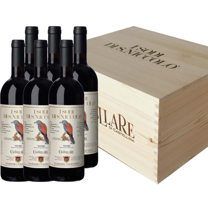 Cassa legno contenente 6 bt di Sodi di San Niccolò, il vino simbolo dell'Azienda Castellare di Castellina.