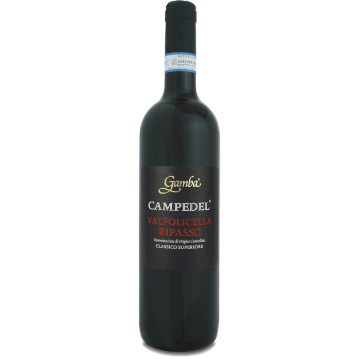 Campedel è il vigneto che fa nascere le uve per la linea di vini più pregiati della cantina Gamba. Si trova a trecento metri di altitudine sulla collina Gnirega, nel cuore della Valpolicella, e poggia su un suolo calcareo argilloso con presenza di tufo negli strati inferiori, l'ideale per preservare la vite da eventuali periodi di siccità prolungata. Il Ripasso Campedel è ottenuto da uve Corvina, Corvinone, Rondinella e Oseleta vinificate in ottobre e “ripassate”, cioè fatte rifermentare nel mese di febbraio sulle vinacce del prezioso Amarone Campedel. Il vino poi trascorre quattro mesi in botti di acciaio e completa la maturazione in barrique per un periodo di quindici mesi. E’ un rosso dal colore profondo, sfumato di viola, profuma di ciliegie e lamponi, cannella e vaniglia, zenzero e tabacco, al palato è morbido e complesso, con tannini vellutati e ben definiti. Anatra, piccione, tacchino e faraona, cucinati sapientemente secondo la tradizione gastronomica regionale, staranno benissimo accanto al Ripasso Valpolicella Classico Superiore DOC Campedel della cantina Gamba.
