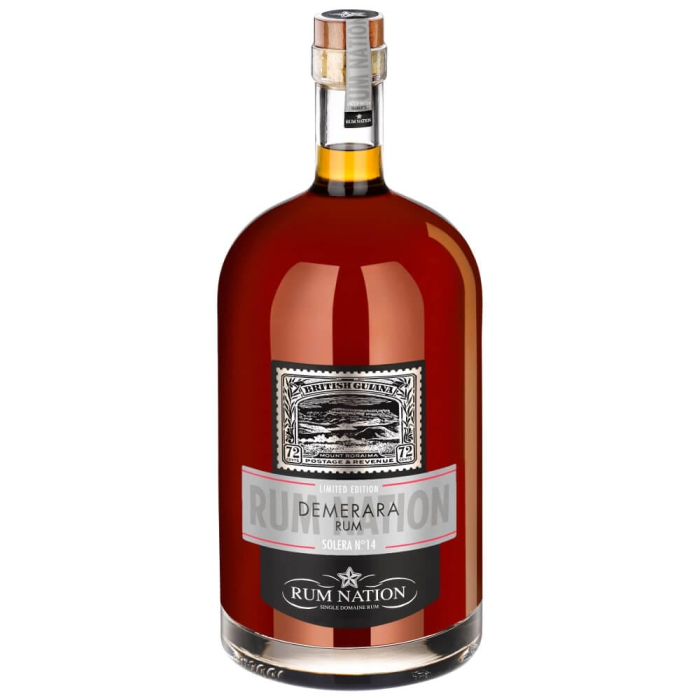 La grande qualità della materia prima e lungo invecchiamento confermano la supremazia dei rum selezionati da Fabio Rossi, vincitori di numerose e prestigiose competizioni. Questo, come tutti i Rum della selezione Rum Nation di Fabio Rossi, esprime con esplosiva esubreranza lo spirito della terra di origine, ed esaudisce il desiderio degli intenditori più appassionati di godere di un distillato raro e prezioso. Anche il formato formato speciale di quattro litri e mezzo contribuisce all’unicità del Rum Demerara Solera N 14 di Rum Nation.